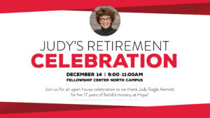 Come to this open house gathering to celebrate and give thanks for Director of Women’s Ministry, Judy Siegle Aamodt’s 17 years of faithful ministry at Hope!