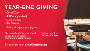 A weekly large group study where you will grow through reading and reflection. All adults are welcome. No sign-up is necessary. Join us anytime! For details, visit fargohope.org/adults.